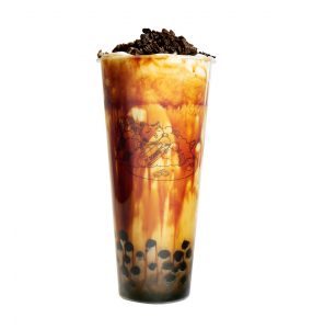 Lait de vache, Milkcover (lait de vache, crème), Sucre brun, Tapioca noir mariné, Oreo Écrasé